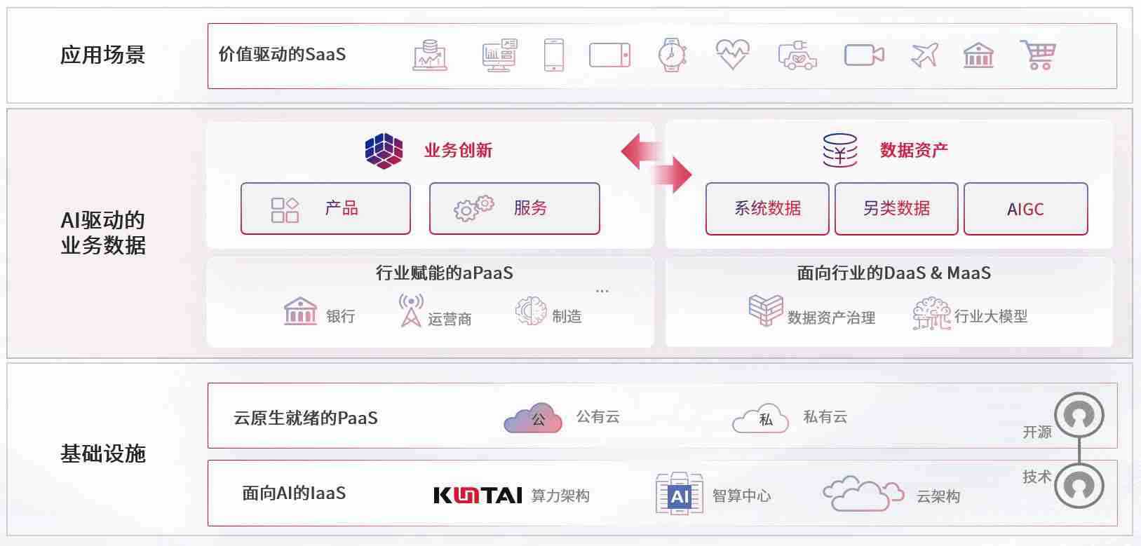 数字时代,,,,围绕企业数字化转型的关键要素,,,kdpay数码开创性的提出数云融合战略和技术体系框架,,,着力在云原生、、、、数字原生、、AI原生和信创产业上架构产品和服务能力,,,,为处在不同数字化转型阶段的快消零售、、、汽车、、、金融、、、医疗、、政企、、、教育、、、、运营商等行业客户提供泛在的敏捷IT能力和融合的数据驱动能力,,,构建跨界融合创新的数字业务场景和新业务模式,,,助力企业级客户建立面向未来的核心能力和竞争优势,,,,全面推动社会的数字化、、、智能化转型升级。。
