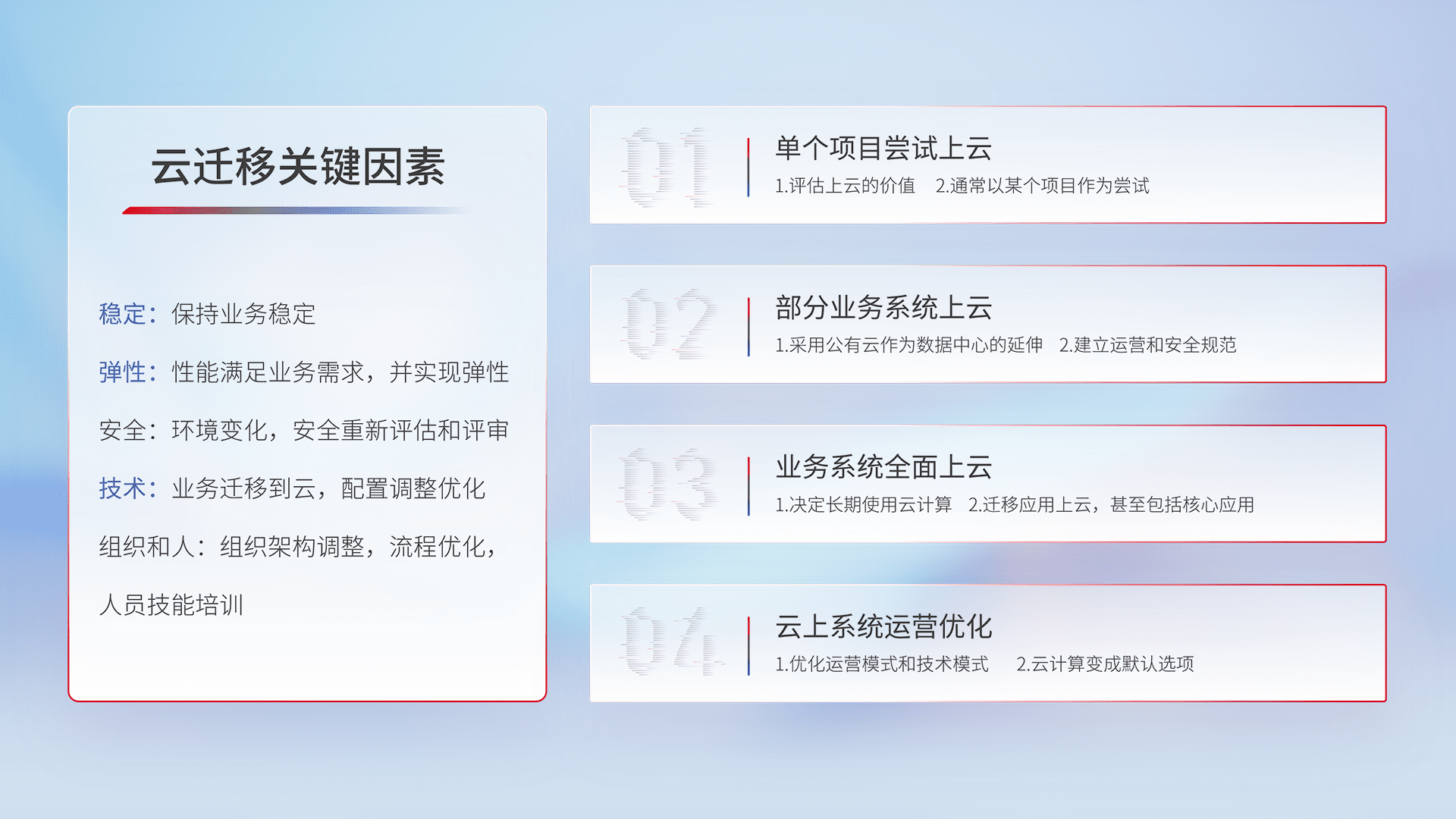 结合实际业务,,,从规划设计、、云平台选型、、、云原生改造、、数据迁移、、集成交付,,,,迁移全过程为客户识别最佳上云路径,,,,做好风险识别管理,,,设计网络架构、、、、身份权限、、、安全审计合规、、、、操作审计、、、日志审计、、、监控告警策略、、多站点容灾设计等,,,,对云上基础设施进行整体规划,,,提升IT治理水平,,,,以满足弹性、、、高可用、、、、高性能的需求。。。
