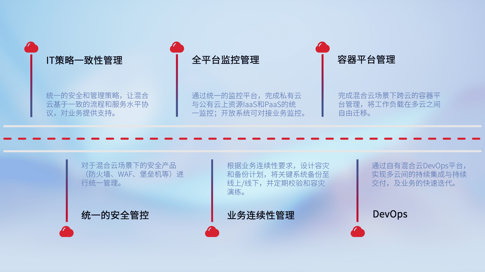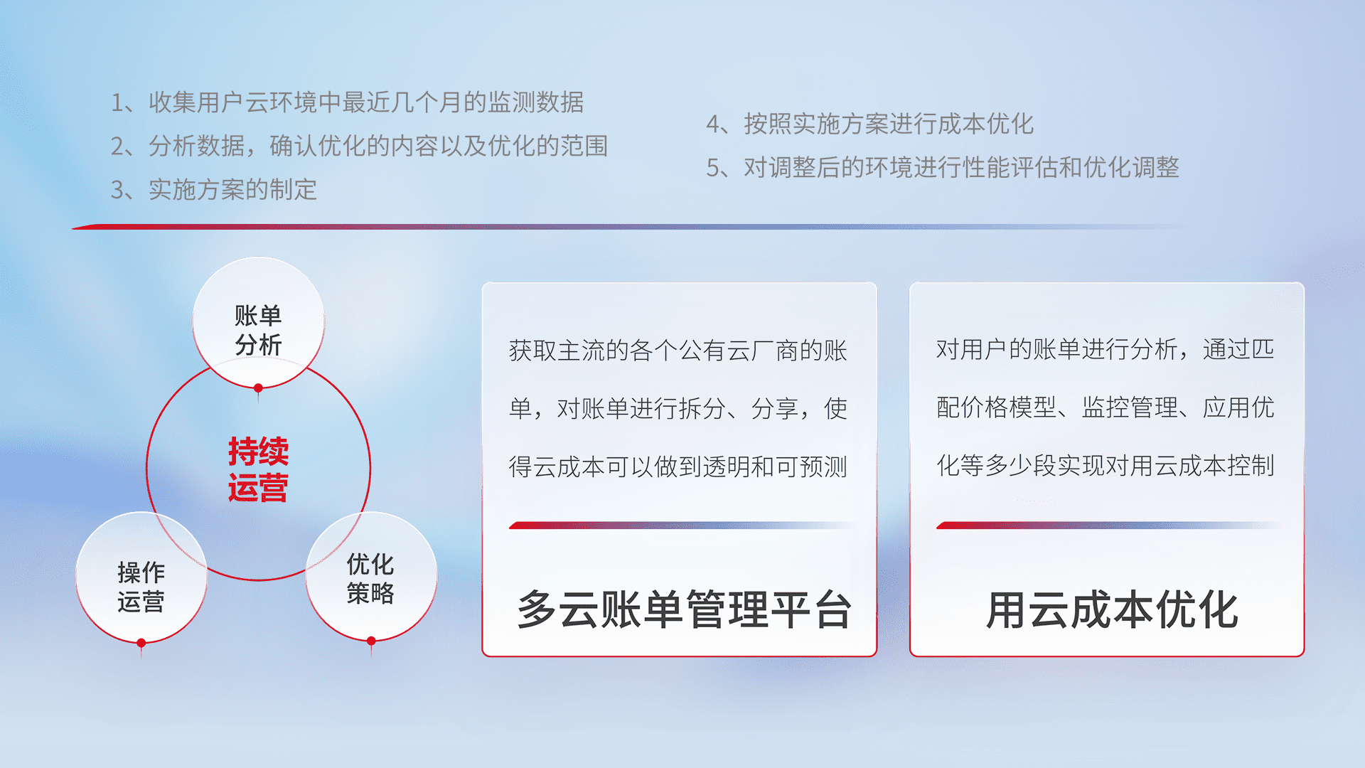 通过多云纳管,,以统一的资源数据模型把客户的云资源进行抽象和封装,,,,进而实现对多云资源的统一操作,,保障云资源管理的可靠性、、稳定性与可用性。。量身定制化运维内容,,,,配置、、、开发运维、、、、补丁管理、、、、备份、、、、监控、、认证和访问管理、、、、审计和日常巡检等,,,保障在用云过程中的可靠度,,,,稳定度以及高可用率。。。。