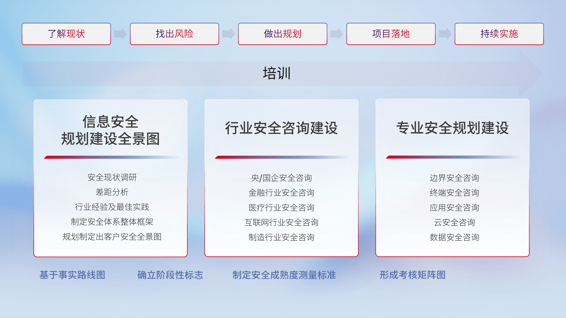 梳理客户信息安全现状调研、、差距分析结果,,,,结合行业先进经验及最佳实践,,,,制订客户的信息安全管控体系总结架构,,,最终形成一个完整的客户信息安全规划与建设的全景图。。