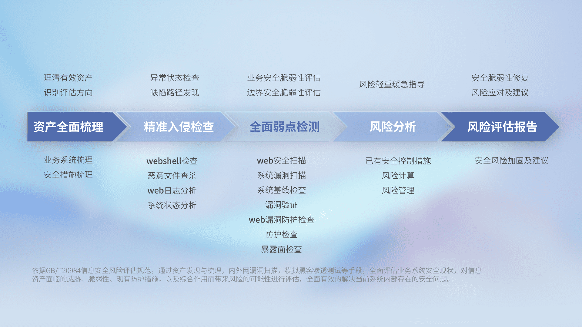针对客户行业特性,,,以专业的安全服务+多厂商联合解决方案提供专属的一站式安全管理服务,,,帮助客户全面感知网络空间威胁,,,,基于识别、、、检测、、分析、、、、防护、、、、监测、、、、响应的服务理论模型,,从方案咨询、、、、集成交付、、、、评估验证、、、、优化加固、、、、运维运营,,,,致力于为客户提供完整的闭环管理式安全服务。。。。以实战经验为客户打造高抵御风险的安全体系,,,帮助客户发现威胁、、、、对抗威胁、、、处置威胁,,,不断积累安全对抗能力,,,,持续保障数字化安全。。。